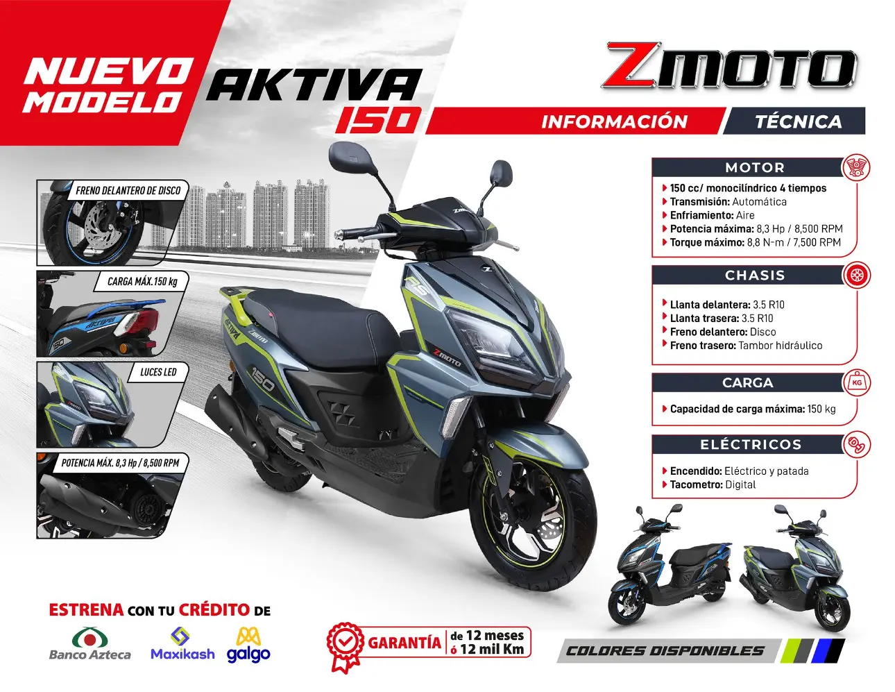 Exprésate en tu moto con estilo tan único como su piloto. La Aktiva es una moto versátil y fácil de manejar, con un motor 150cc que te mueve con facilidad. Los frenos de disco de la Aktiva te dan un nivel más de seguridad, y su transmisión automática te permite manejarla como experto desde el día 1.