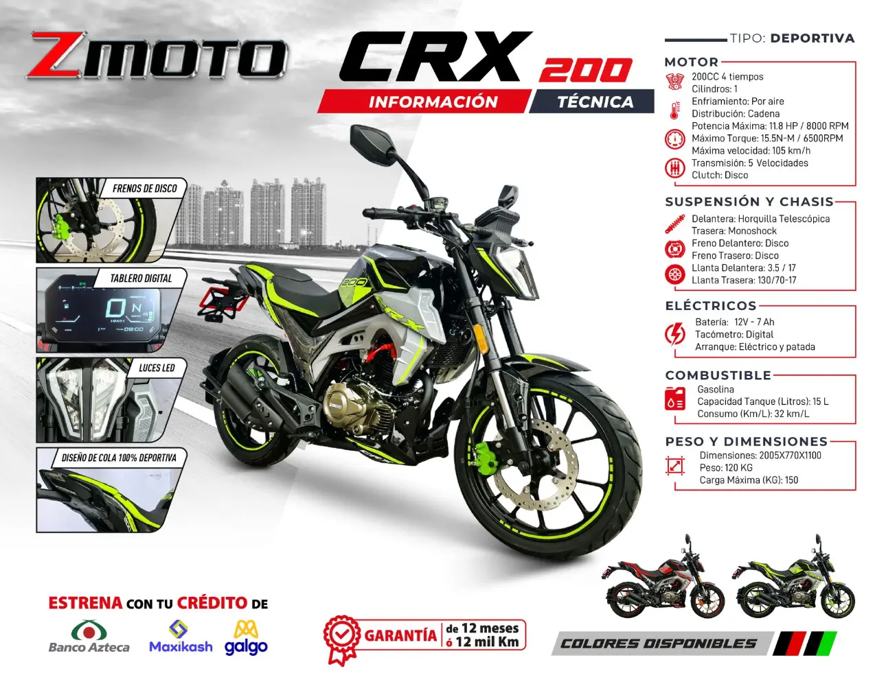 Diseñada para brindar una experiencia de conducción cómoda y versátil, tanto en la carretera como fuera de ella. La CRX 200 cuenta con una potencia máxima de 15.8 HP / 8000 RPM y un torque máximo de 15.5 Nm / 6000 RPM, esta moto es ideal para viajes largos y aventuras todoterreno. También cuenta con un motor 200 cc/monocilíndrico de 4 tiempos que le brinda potencia suficiente para ofrecer una experiencia de conducción emocionante y un diseño deportivo a otro nivel.